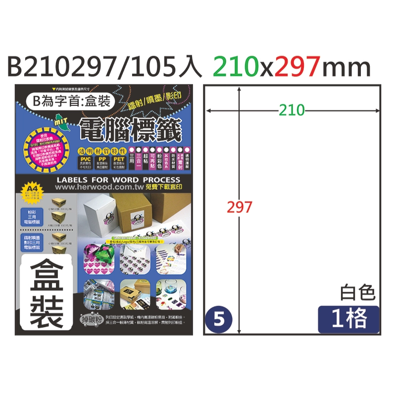 三用電腦標籤 #005 B210297 白 1格 105入 / 210×297mm