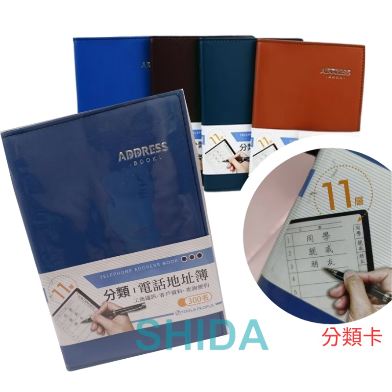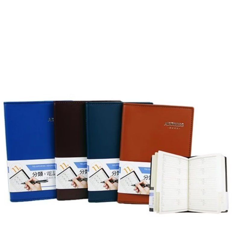 TA-351 分類電話地址簿,內頁可登記約300名資料,附分類索引卡設計,方便依姓氏或類別快速查找,適合公司行號、門市商家、業務人員與家庭使用。內頁格式清晰,可填寫姓名、電話、地址、備註等資訊,分類管理更有效率。硬殼封面設計,耐翻耐用不易變形,辦公桌收納整齊有質感,是工商通訊與客戶資料管理的實用工具